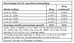 Interesante este informe que ha presentado HitWise, de la firma americana sobre AnalÃtica Web. En él podemos ver como Bing, el nuevo buscador de Microsoft, durante el mes de Junio consiguió aumentar sus búsquedas, pero todavÃa se sitúa por detrás de Google y Yahoo.